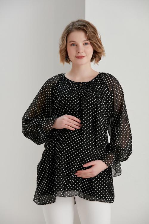şifon zarifliği puanlı desen ile güzel bir görünüm aldı, bağlamalı yaka ve lastikli kolları ile tasarlanan model, hamilelik süresince ve sonrasında da kullanıma uygundur...