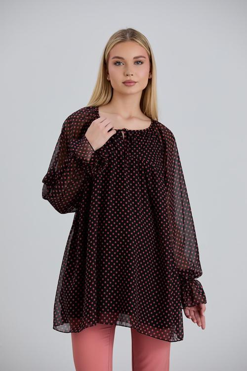 şifon zarifliği puanlı desen ile güzel bir görünüm aldı, bağlamalı yaka ve lastikli kolları ile tasarlanan model, hamilelik süresince ve sonrasında da kullanıma uygundur...