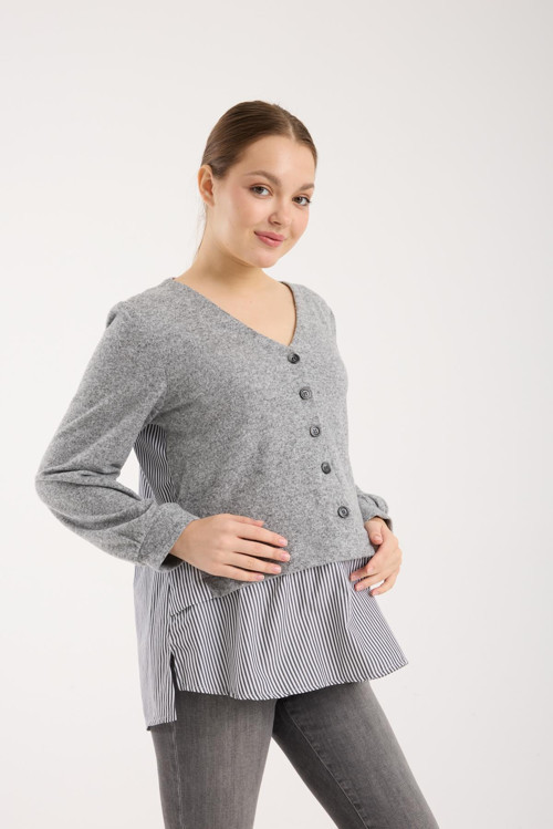 V Yaka Düğmeli Minnoş Triko Kombin Hamile Bluz