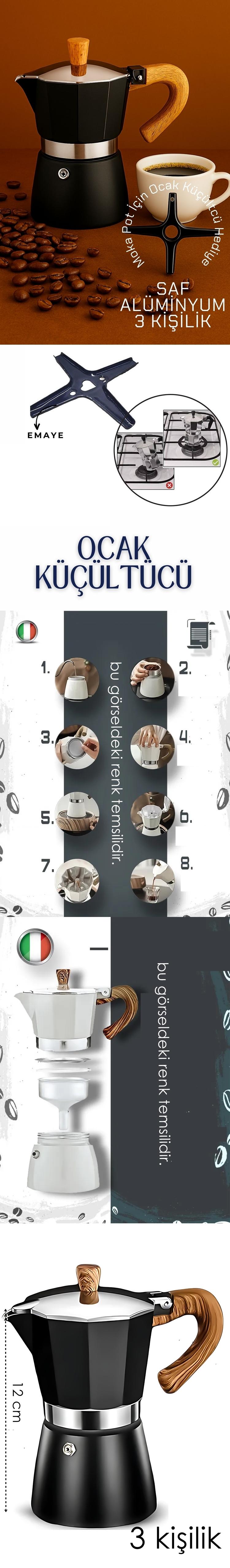 Teknik Ölçüler: - Yükseklik: 12 cm - Kapasite: 3 fincan - Malzeme: Saf alüminyum gövde, emaye ocak adaptörü - Sap ve düğme: Ahşap dokulu ısıya dayanıklı