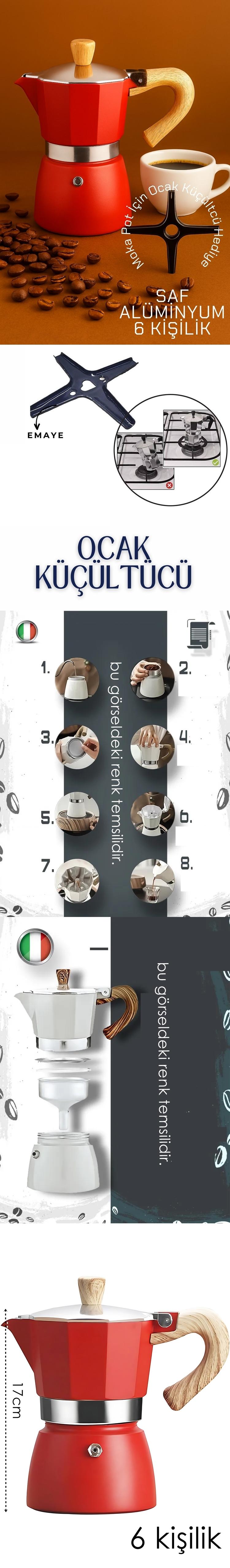 Italyan Moka Pot - 6061 Saf Alüminyum  Ahşap Saplı - 6 kişilik KIRMIZI
