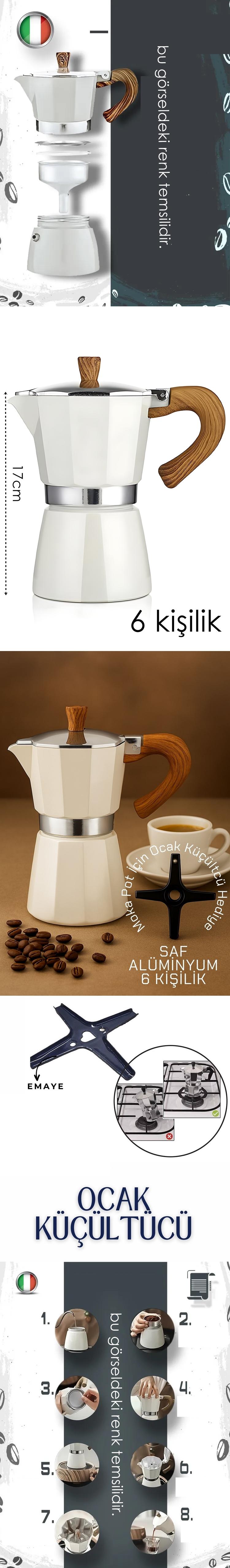 Teknik Ölçüler: - Yükseklik: 17 cm - Kapasite: 6 fincan - Malzeme: Saf alüminyum gövde, emaye ocak adaptörü - Sap ve düğme: Ahşap dokulu ısıya dayanıklı