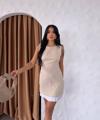Buklemoda İthal Dabıl Kumaş Pileli Elbise Krem