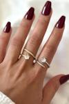 BFS Pirinç Gold Renk Zirkon Taşlı İncili Taç Model Ayarlanabilir Kadın Yüzük - Image 1