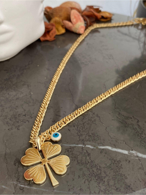 Altın renginde şık tasarımıyla dikkat çeken bu kolye, zarif görünümüyle her ortama uyum sağlar.