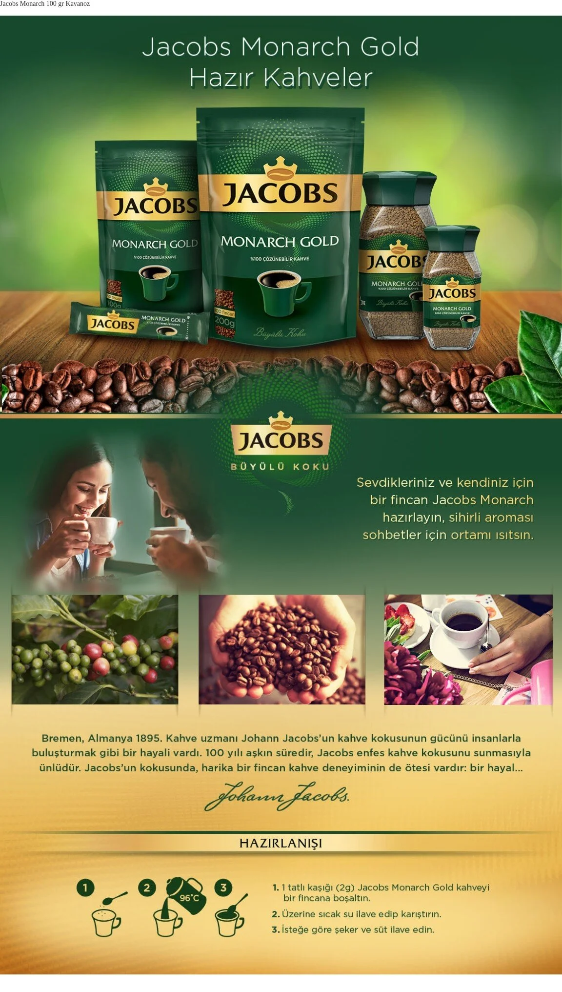 Jacobs Monarch Gold 100 gr. karşı konulmaz kokusu, lezzeti ve yumuşak içimi ile sizi büyüleyecek. Kahvenin o hoş kokusunu tam olarak hissedeceğiniz, yüksek kalitedeki kahve çekirdeklerinden üretilmiş Monarch'ı sade içebileceğiniz gibi; süt, kahve kreması veya şeker ilavesi ile de tercih edebilirsiniz. Bu kahve molalarınıza keyif katarken, şık kavanozu ile mutfağınıza da şıklık katacak.