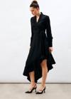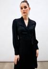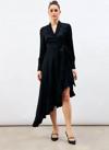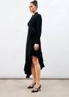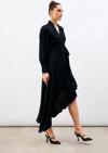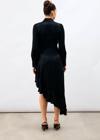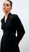 Kruvaze yaka, yan fermuarlı, bel kuşaklı, balon ve manşetli kol, jakarlı asimetrik elbise.