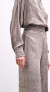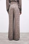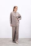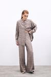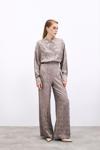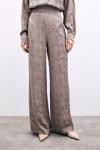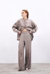 Yüksek bel, yan fermuarlı, desenli salaş pantolon.