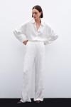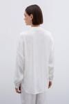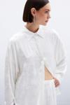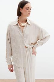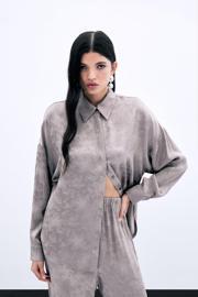 Ön gizli pat, düşük omuz, ince manşetli uzun kol, kalça altı boy, jakarlı salaş saten gömlek.