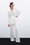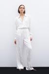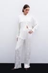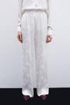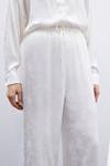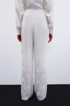 Yüksek ve lastikli bel, salaş kalıp, jakarlı saten pantolon.