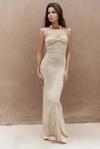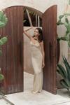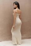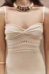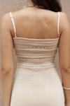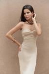 İnce askılı, düz yaka uzun triko elbise. Göğüs çapraz detaylı. Astarsız.