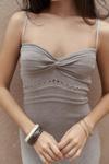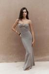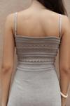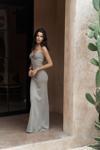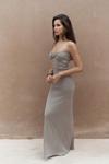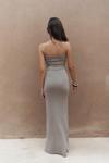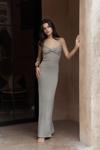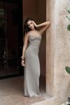 İnce askılı, düz yaka uzun triko elbise. Göğüs çapraz detaylı. Astarsız.