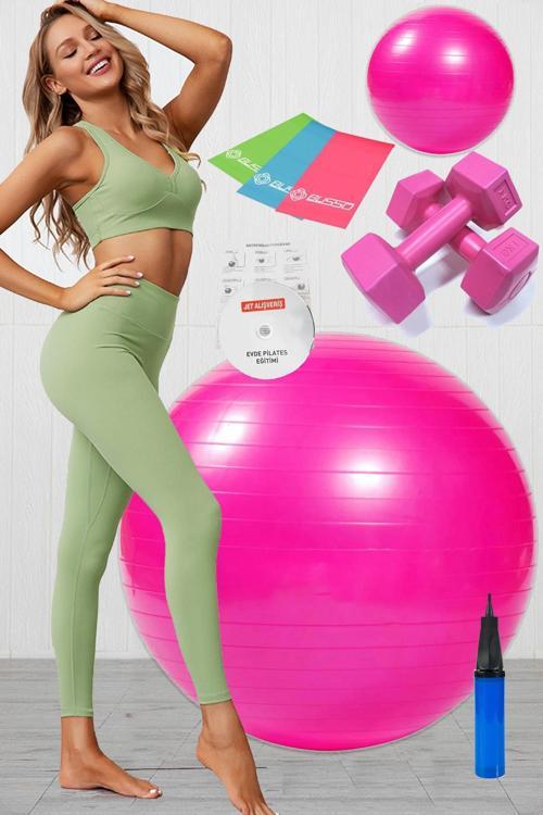 Jet 9 Lu Pilates Seti Plates Takımı Pilates Topu 1 Kg Dambıl Pompa 3 Lü Direnç Bandı Lastiği Set Pembe