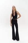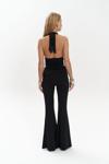 Sırtı açık, boyundan bağlamalı ve derin göğüs dekolteli crop top. Yüksek bel kemer detaylı, streç kumaş palazzo pantolon.