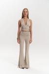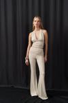 Sırtı açık, boyundan bağlamalı ve derin göğüs dekolteli crop top. Yüksek bel kemer detaylı, streç kumaş palazzo pantolon.
