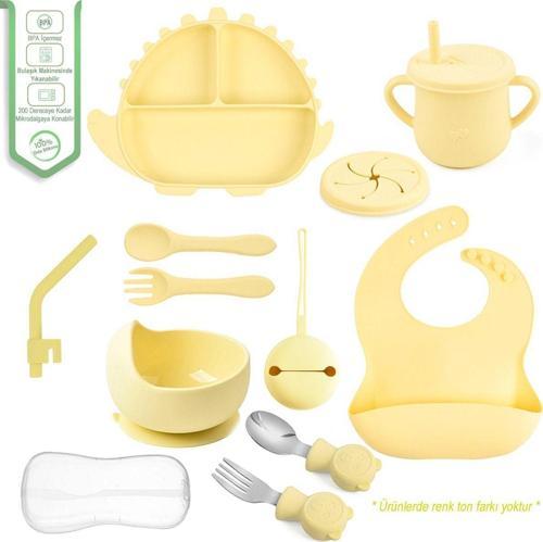 Jojobebek Silikon Beslenme Seti - Mama Tabağı - Kase - Çatal - Kaşık - Pipet - Bardak - Önlük - Emzik Kılıfı - Sarı