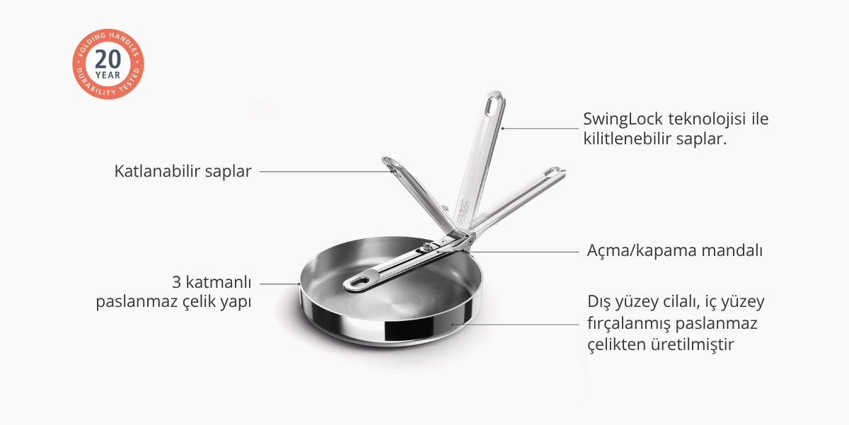 Joseph Joseph’in yenilikçi SwingLock™ sap teknolojisi, dayanıklı paslanmaz çelik sapın kolayca katlanmasını sağlar. Bu sistem, ürün boyutunu %50’ye kadar küçültür ve 20 yıllık dayanıklılık testinden geçmiştir. Kullanmadığınızda sapı katlayarak tavanızı düz bir şekilde saklayabilir, mutfak dolaplarınızda ekstra alan kazanabilirsiniz.