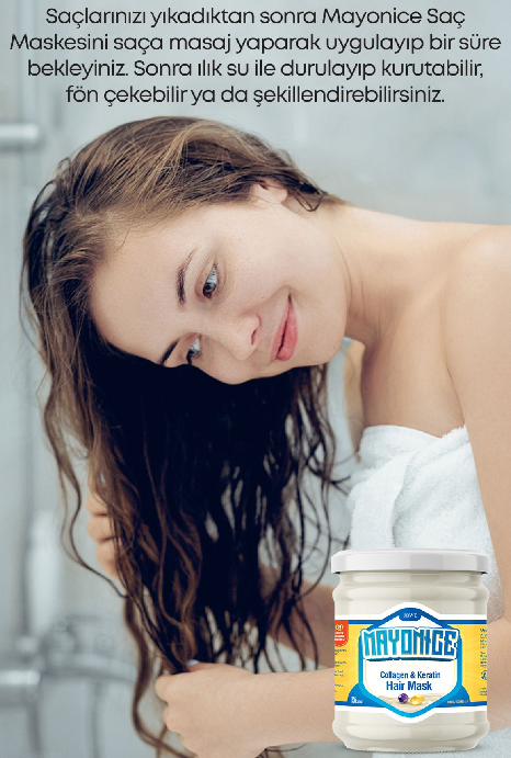 Saçlarınızın daha canlı ve bakımlı olup, güçlenmesine yardımcı olmak amacıyla ürettiğimiz inovatif Mayonice saç maskesi içeriğindeki kolajen desteği ile yıpranmış saç tellerinin hasarının onarılmasına yardım eder.