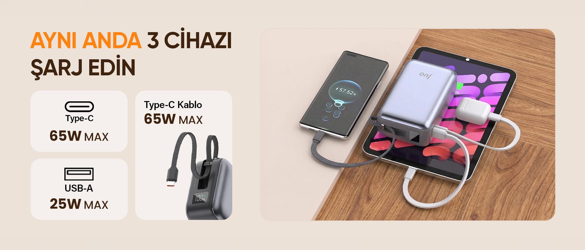 Juo Powerbank, Type-C kablo, Type-C port ve USB-A port ile aynı anda üç farklı cihazı şarj etmenize olanak tanır. Type-C kablo ile 65W, Type-C port ile 65W ve USB-A port ile 22.5W maksimum çıkış gücüne sahiptir. Aynı anda farklı cihazları şarj etmek için idealdir.
