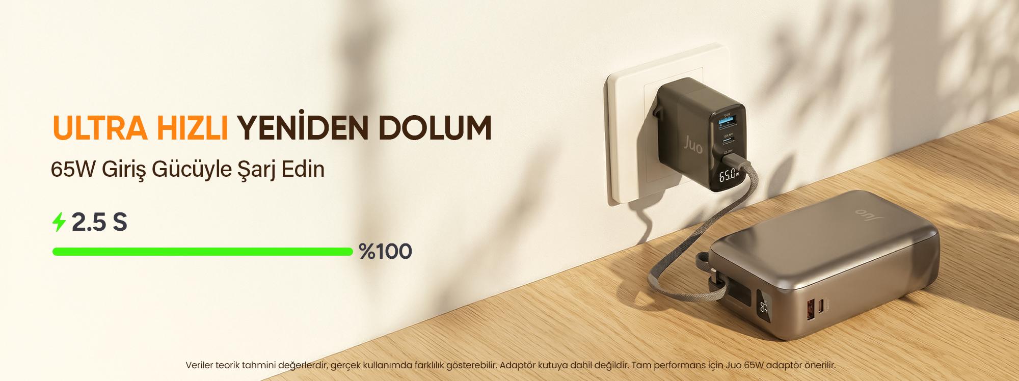Juo Powerbank, 65W yüksek güç çıkışı ile telefon, tablet ve dizüstü bilgisayar gibi farklı cihazları hızlı bir şekilde şarj etmenize olanak tanır. Güç çıkışını cihazınızın ihtiyacına göre ayarlayan şarj teknolojisi, cihazınızın güvenliğini koruyarak şarj etmenizi sağlar.