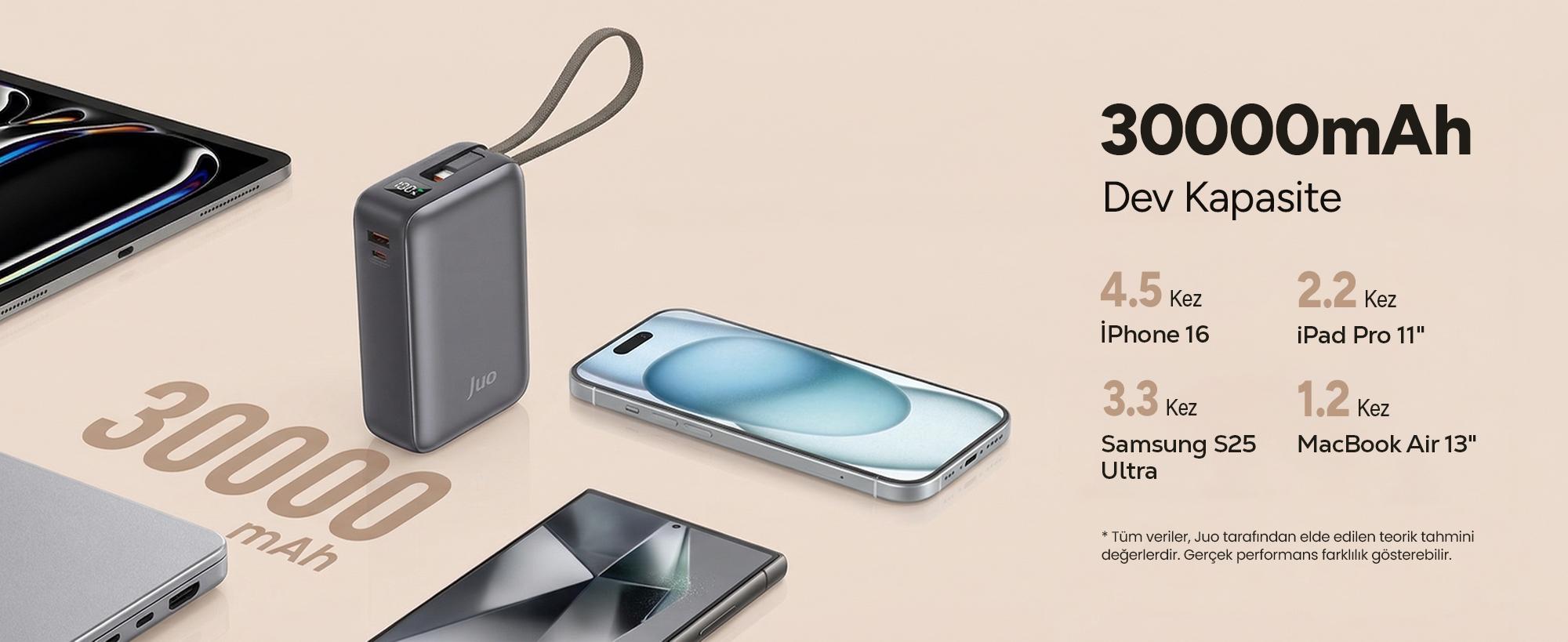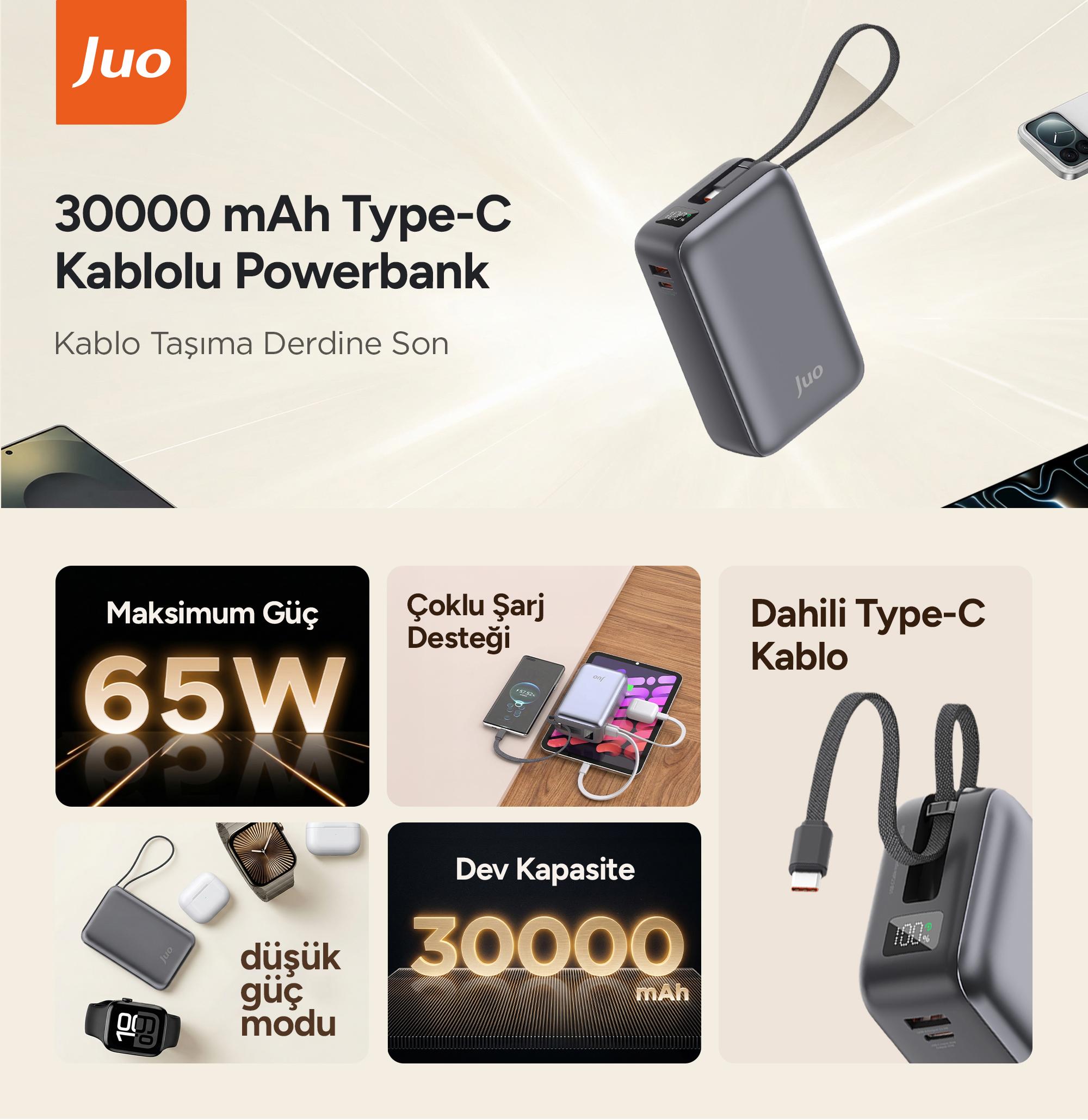 Juo 30000 mAh Type-C Kablolu Powerbank, 65W hızlı şarj desteği ve entegre kablo tasarımıyla akıllı telefon, tablet ve dizüstü bilgisayar gibi farklı cihazları tek seferde şarj etmenizi sağlayan modern bir güç kaynağıdır. 30000 mAh yüksek kapasite ile seyahatlerinizde veya uzun yolculuklarda cihazlarınızı şarjının bitmesini engeller. Entegre Type-C kablo tasarımı, ekstra kablo ihtiyacını ortadan kaldırarak her an yanınızda olacak şekilde tasarlanmıştır. 65W yüksek güç çıkışı sayesinde cihazlarınızı tamamen şarj edebilirsiniz. Düşük güç modu ile akıllı saat ve kulaklıklar gibi düşük güç tüketimli cihazları güvenle şarj edebilirsiniz.