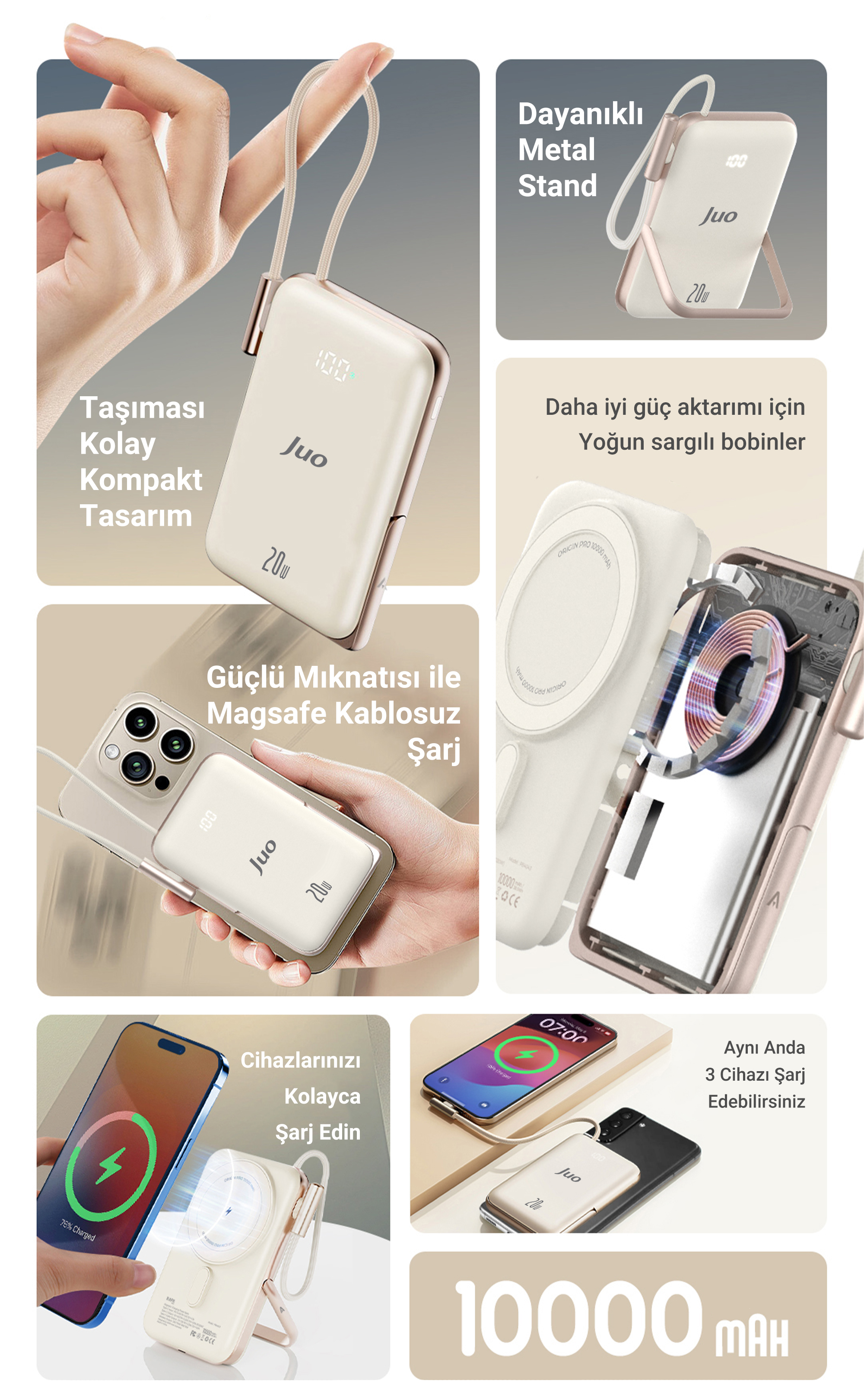 Juo JMP710 Manyetik Magsafe Standlı 10.000mAh 20W kendinden type-c kablolu taşınabilir şarj aleti (powerbank) ile ekstra güç kablosuna gerek duymadan akıllı telefon, tablet (Samsung, iPhone, Xiaomi, Huawei v.b) gibi cihazlarınızı rahatlıkla şarj edebilirsiniz. Cihaz üzerinde yerleşik olarak 20W çıkış gücüne sahip USB-C tip kablo bulunmaktadır. Dahili type-c kablo ile (Samsung, Xiaomi, Reeder, Huawei, Realme, Oppo, Poco, Redmi v.b) iPhone, android tablet telefon gibi type-c porta sahip cihazlarınızı 20W güç desteği ile hızlı şarj edebilirsiniz. Juo JMP710 aynı anda 3 cihaza kadar desteklemektedir. Manyetik Magsafe özelliği ile iPhone ve Android uygun cihazlarınızı kablosuz olarak şarj edebilirsiniz. Magsafe kablosuz şarj, dahili type-c kablolu şarj etmenin haricinde kutu içerisinden çıkan type-c to type-c kablo ile powerbankin yan tarafında bulunan USB-C porttanda 20W a kadar şarj işlemi sağlayabilirsiniz. Bu port hem powerbanki hemde akıllı cihazlarınızı şarj etmek için çift yönlü (giriş-çıkış) olarak kullanılmaktadır. Dahili kabloyu type-c porta takarak powerbankinizi yanınızda rahatça taşıyabilirsiniz. Juo JMP710 Magsafe Powerbankin çinko alaşım malzemeden üretilen standlı tasarımı cihazınızı kullanırken kolaylık sağlar; böylece hem şarj edebilir hem de videolarınızı izleyebilirsiniz. Yeni nesil akıllı çipler sayesinde yüksek güvenlik ve hızlı şarj imkanı sağlamaktadır. Lityum Polimer (Li-Po) bataryası ile uzun ömürlü şarj/deşarj döngüsü sağlamaktadır.Dijital Led Ekranı, taşınabilir şarj aletinin kalan pil yüzdesini görebilirsiniz. Aynı ekran üzerinde yeşil ibareli hızlı şarj işareti ile hem powerbank hemde şarj ettiğiniz cihazlarınızın hızlı şarj olduğunu kontrol edebilirsiniz.
