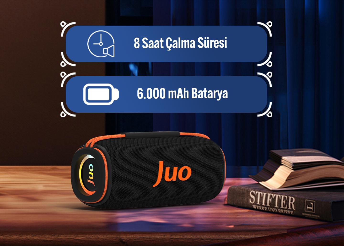 6000mAh mega batarya kapasitesi ile ortalama volümde 8-10 saat kesintisiz müzik dinleyebilirsiniz. Standby modunda 25 saat bekleyebilen hoparlör, Type-C kablo ile 3 saatte tam şarj olur ve tüm gün kullanıma hazır hale gelir.