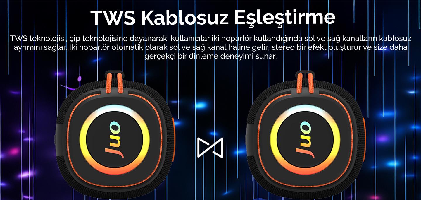 360 derece panoramic sound effect teknolojisi ile her açıdan mükemmel ses kalitesi sağlayan bu yüksek sesli Bluetooth hoparlör, Jerry JL5.3 çipset ve Bluetooth 5.3 teknolojisi sayesinde 10-15 metre mesafede stabil bağlantı kurar. TWS equipment interconnection özelliği ile iki hoparlörü birleştirerek stereo ses deneyimi yaşayabilirsiniz.