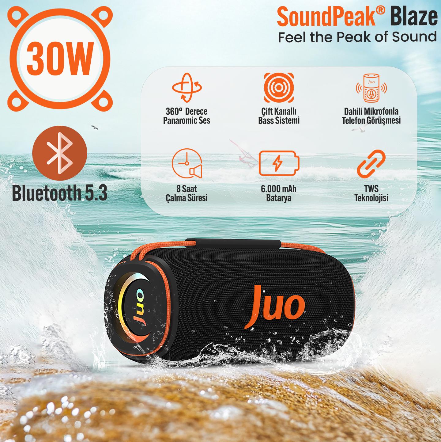 Juo SoundPeak Blaze 30W Bluetooth Hoparlör, yüksek güç ve üstün ses kalitesi arayanlar için tasarlanmış profesyonel seviyede kablosuz hoparlör deneyimi sunar. 2x15W çift hoparlör sistemi ve 78mm horn boyutu ile güçlü bass performansı sağlayan bu taşınabilir hoparlör, 6000mAh mega batarya kapasitesi ile 8-10 saat kesintisiz müzik keyfi vadeder. RGB aydınlatma sistemi ve IPX6 su geçirmez özelliği ile her ortamda mükemmel performans gösteren bu yüksek sesli Bluetooth hoparlör, parti ve açık hava etkinliklerinizin vazgeçilmez parçasıdır.