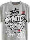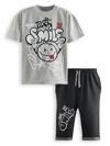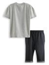 2 parça erkek çocuk t-shirt ve kapri şort takım. Kısa kol, gri melanj t-shirt. Üzeri grafitti baskılıdır. Takımın tamamlayıcısı orta kalın kumaştan, düşük ağ kesimli, kapri boy şort. 2 yan ceplidir. Bir paçasında baskı detayı vardır. Beli kordonludur. Kordon arka bele sabitlenmiştir. Bu ürün Avrupa standartlarında "Çocuk Güvenliği Kuralları" gözetilerek üretilmiştir. İğne dedektörlerinden geçirilmiştir.
