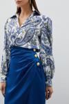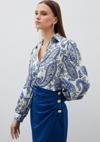 Ön yarım düğmeli, kabarık kol, desenli salaş gömlek.
