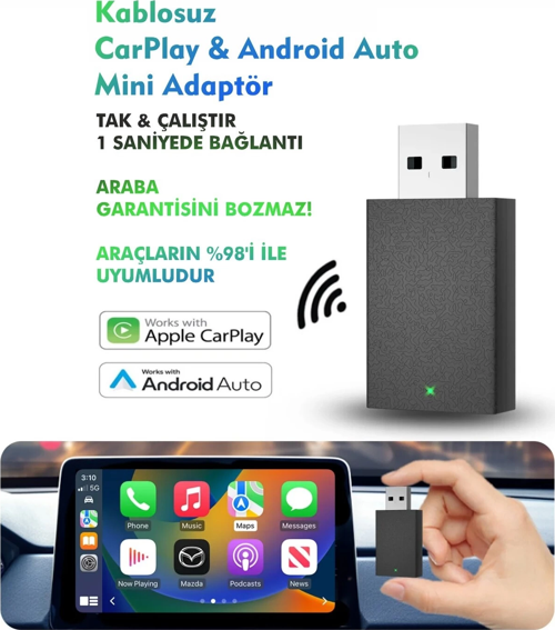Android Auto/Car Play özelliğine sahip araçlarınızda kablosuz bağlantı sağlayarak bu özellikleri kullanmanızı sağlayan USB dongle cihazı, Genel Markalar güvencesiyle sizlerle.