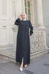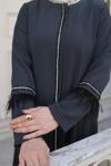 Tüyla ferace, zarif ve şık bir giyim parçasıdır. Kollarındaki tüylü detaylar,feracenin modern ve dikkat çekici bir görünüm kazanmasını sağlar. Petek krepkumaş ise hafif, dökümlü ve nefes alabilir bir yapıya sahiptir