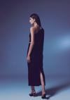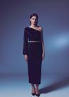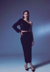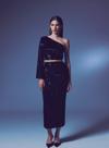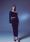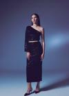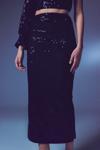 Yüksek bel, arka fermuarlı, iç astarlı, kadife payetli midi etek.