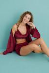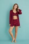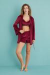 Şort ve büstiyerin hafifliği, sabahlığın zarif dokunuşuyla tamamlanıyor.