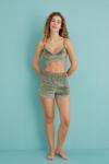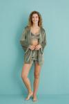 Şort ve büstiyerin hafifliği, sabahlığın zarif dokunuşuyla tamamlanıyor. Yumuşacık kadife kumaşı sayesinde gün boyu konfor sağlarken, modern kesimiyle stilinizi evde de yansıtabilirsiniz.
