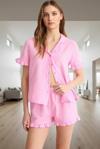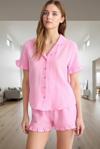 Bu pijama takımı, yüksek kaliteli %100 pamuklu müslin kumaştan üretilmiştir. Yumuşak, nefes alabilir ve cilde nazik dokusu, gün boyu rahatlık sağlar. Fırfırlı detaylarıyla feminen bir dokunuş katan takım, klasik gömlek yaka ve kısa kollu tasarımıyla her tarza uyum sağlar. Regular kalıbıyla her vücut tipine rahatça oturur. Normal bel şortu ile tam bir uyum sağlar. Evde veya lounge alanlarında rahatlıkla kullanabileceğiniz bu takım, yaz aylarının vazgeçilmez parçası olacaktır.