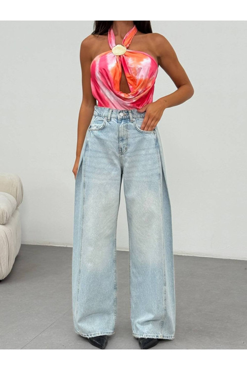 Kadın Açık Mavi Yüksek Bel Geniş Paça %100 Pamuk Jean Pantolon