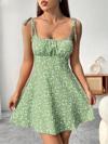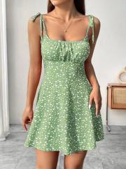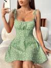 Kadın Askılı Büzgü Detaylı Kare Yaka çiçek Desenli Mini Süprem Elbise