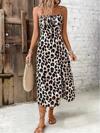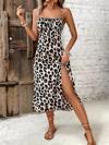 Kadın Askılı Yakadan Bağcıklı Yırtmaçlı Leopar Desenli Midi Süprem Elbise