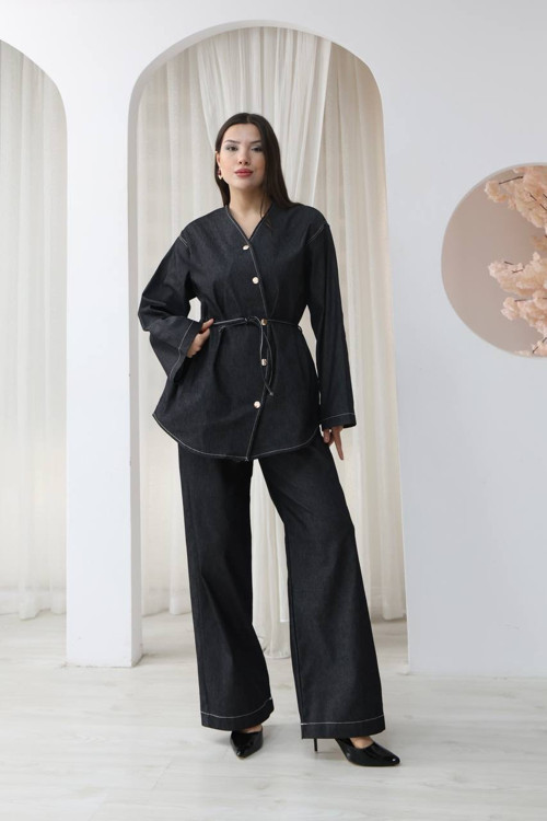 • Şık tasarım detayları: Bel kısmındaki bağlama detayı, kontrast dikiş görünümü ve V yaka formu takıma modern ve özgün bir stil kazandırır.