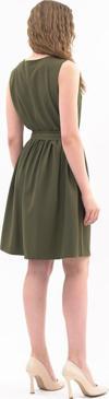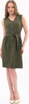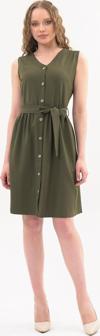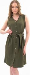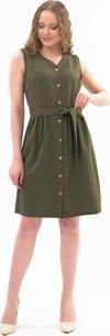 Sıfır kol, astarsız tasarım; düğmeli, bağlama detaylı V yaka elbise. Rahat ve terletmez kumaş yapısıyla konforlu bir kullanım sunar.
