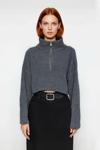 Ersefa Kadın Basic Oversize Düşük Uzun Kollu Crop Fermuarlı Dik Yaka Triko Kazak Kışlık Rahat Stiller