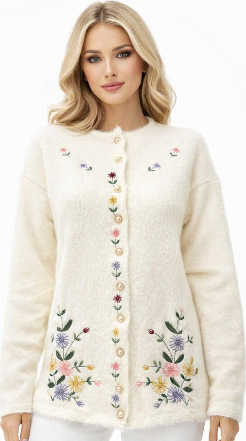Kadın Çiçek Nakışlı Düğmeli Yumuşak Dokulu Triko Hırka