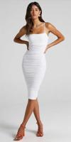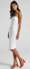 Zarif tasarımıyla dikkat çeken bu beyaz darapeli büzgülü askılı midi elbise, astarlı yapısı sayesinde rahat bir kullanım sunar.