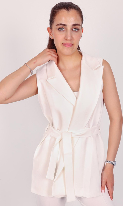 Kadın Beyaz Kolsuz Kuşaklı Yelek