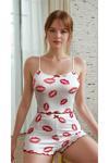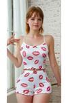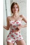 Desenli tasarımı ile dikkat çeken bu pijama takımı, sevimli dudak motifleri ile enerjik ve eğlenceli bir stil yaratır. Şortlu alt parçası ise yüksek bel yapısı ile vücudu sarar ve rahat bir kullanım sunar. Esnek lastik detayı sayesinde hareket özgürlüğü sağlar ve gece boyunca konfor sunar.
