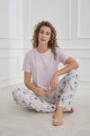 Hafif lila renkli kısa kollu tişörtü ve zarif çiçek desenli alt pijamasıyla bu takım, hem şık hem de rahat bir uyku deneyimi sunar.