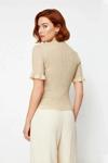 Ürün Özellikleri: Fitted kalıp, viskoz polyester metalize iplik materyal, düz desen, bisiklet yaka, fırfırlı kısa kol, triko kumaş, sarı renk.