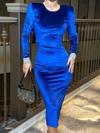 Kadın Bisiklet Yaka Vatkalı Manşet Detay Kadife Kumaş Midi Boy Elbise